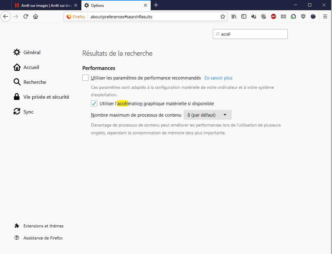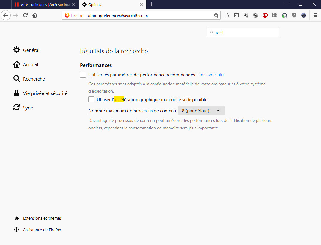 · Sur des versions récentes de Mozilla Firefox, Google Chrome, ou d’autres navigateurs basés sur les mêmes moteurs de rendu, une option est activée par défaut, “l’accélération graphique matérielle”.