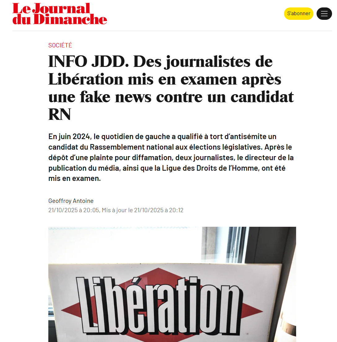 C'est une "INFO JDD" reprise par le ban et l'arrière-ban des médias d'extrême droite : "Des journalistes de Libération mis en examen après une fake news contre un candidat RN", annonce l'hebdomadaire de Vincent Bolloré le 21 octobre. Mise en examen, fake news... de quoi s'agit-il ? "Le 17 juin 2024, les journalistes Pierre Plottu et Maxime Macé écrivaient, dans Libération, que Joseph Martin, candidat RN aux législatives 2024 dans le Morbihan, s'était fendu de publications antisémites sur les réseaux sociaux", affirme le JDD. "Sauf que… tout était faux."