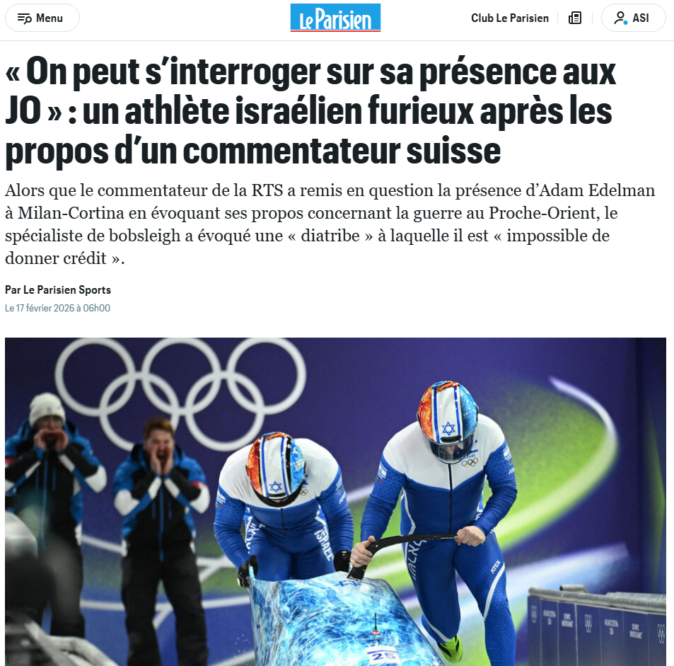 Beaucoup ont retenu la critique d'un athlète israélien, moins celle du Comité international olympique (CIO) et de son deux poids deux mesures concernant les sportifs soutenant des actions de guerre. "Ce lundi, alors que l'équipe israélienne de bob à 2 composée d'Adam Edelman et Menachem Chen disputait les deux premières manches de la compétition, le commentateur a remis en question la présence du premier à Milan-Cortina", résume alors le Parisien à propos de la séquence en rapportant la réaction outrée d'Adam Edelman au commentaire de sa course par la télévision publique suisse RTS.
