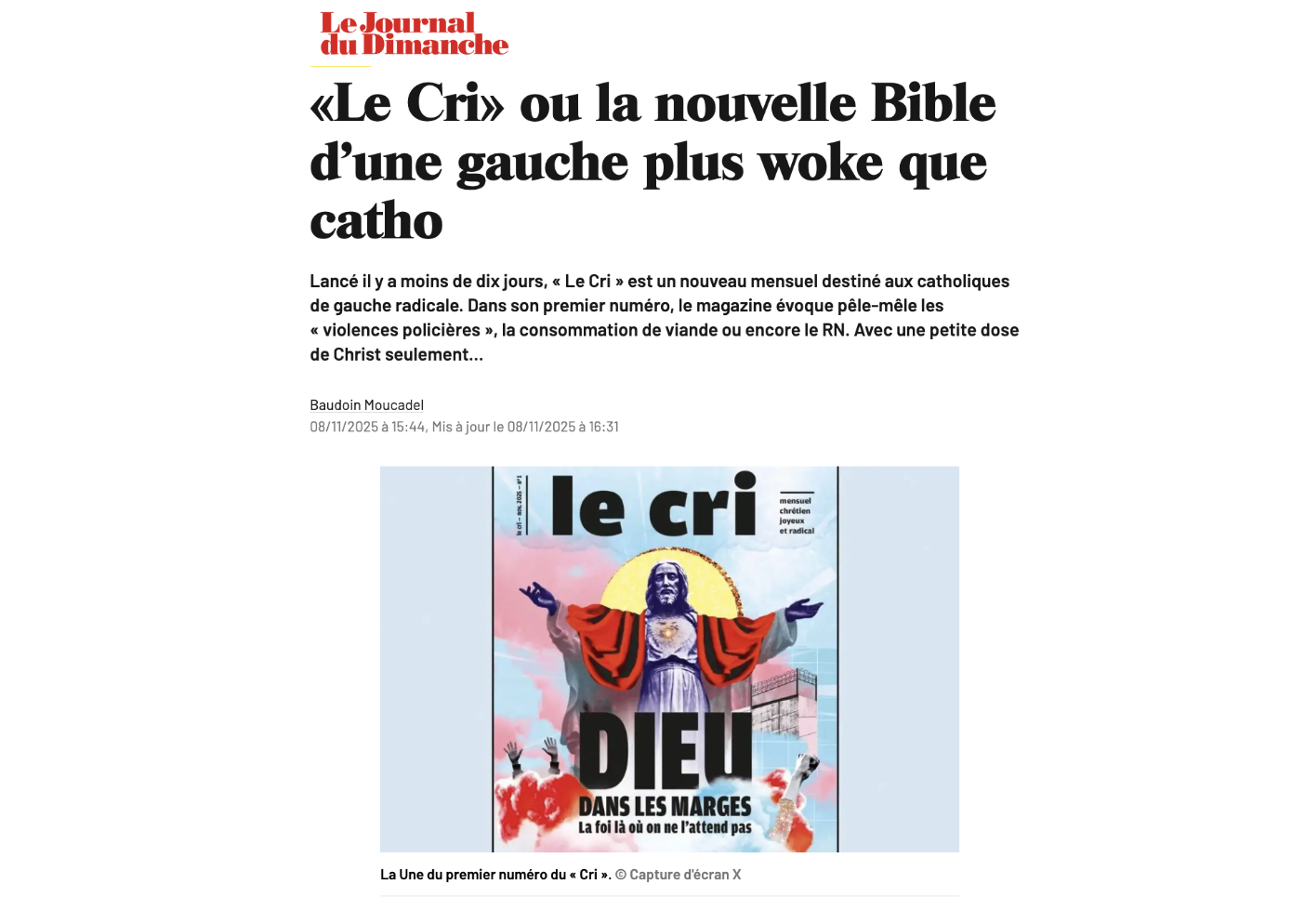 Le premier numéro du "Cri", magazine indépendant "chrétien, joyeux et radical" aux valeurs sociales revendiquées, a suscité une vague d'indignation sur les réseaux sociaux. Les comptes les plus critiques : des personnalités catholiques proches de la droite ou de l'extrême droite, dont certains accusent le nouveau mensuel de ne pas être vraiment chrétien, car trop "révolutionnaire".