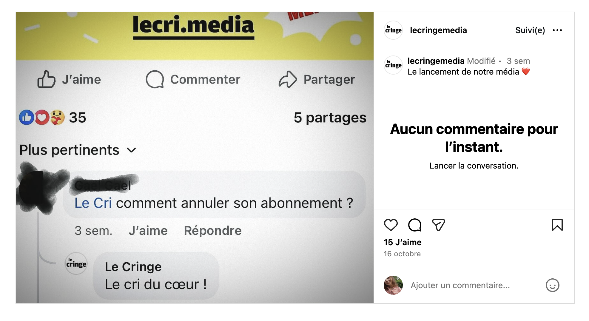 Au milieu de toutes ces critiques, s'est ajoutée une page parodique donc, baptisée "Le Cringe", un jeu de mot en référence à l'expression anglophone "cringe", qui signifie "gênant". Elle publie des attaques sous forme de moqueries envers la ligne éditoriale du Cri. Les pages les plus proches du "Cringe", d'après l'algorithme d'Instagram (qui nous les recommande), sont celles de Frontières, de Valeurs actuelles et de Éric Zemmour. (À noter que la page du "Cringe" pré-existait au Cri. Parmi ses anciens contenus, des déclarations comme : "Monsieur Bobo a les vacances comme arme et comme programme pour repousser les assauts de l'islamisme planétaire". Mais la page se concentre depuis début octobre sur des contenus anti-le Cri).