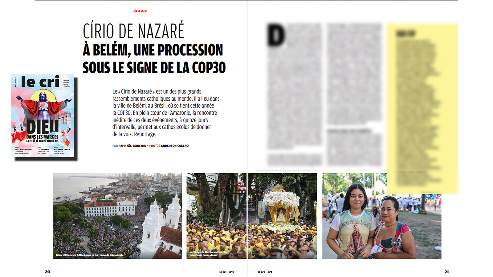 Le contenu du magazine, souligne Théo Moy, est, en plus, largement tourné vers la religion. "Dans le Cri, il y a des témoignages de foi à la première personne. Il y a un évangile et un commentaire de l'Évangile. Il y a des réflexions sur de grands concepts chrétiens. Il y a un contenu spirituel et confessionnel explicite..." Le premier numéro contient par exemple un reportage sur un village palestinien face aux colons, une enquête sur l'extrême droite catholique, un dossier sur "Dieu dans les marges", le compte-rendu d'audience du procès d'un CRS, un reportage sur une procession catholique écologiste ou l'interview d'un écrivain espagnol sur la religion.