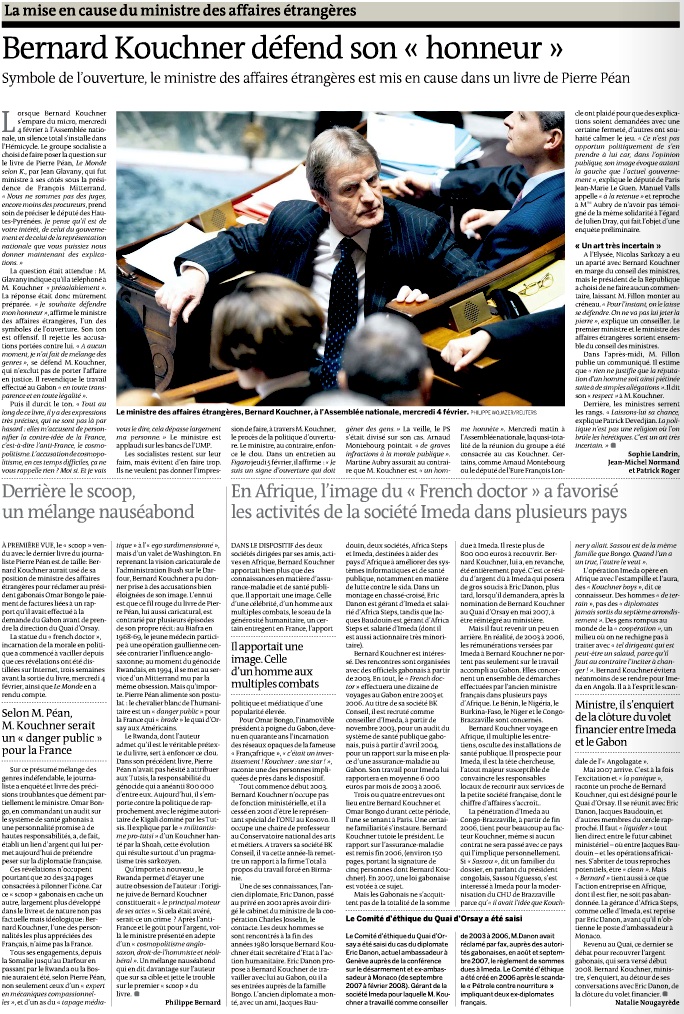 "A première vue, le " scoop " vendu avec le dernier livre du journaliste Pierre Péan est de taille: Bernard Kouchner aurait usé de sa position de ministre des affaires étrangères pour réclamer au président gabonais Omar Bongo le paiement de factures liées à un rapport qu'il avait effectué à la demande du Gabon avant de prendre la direction du Quai d'Orsay."