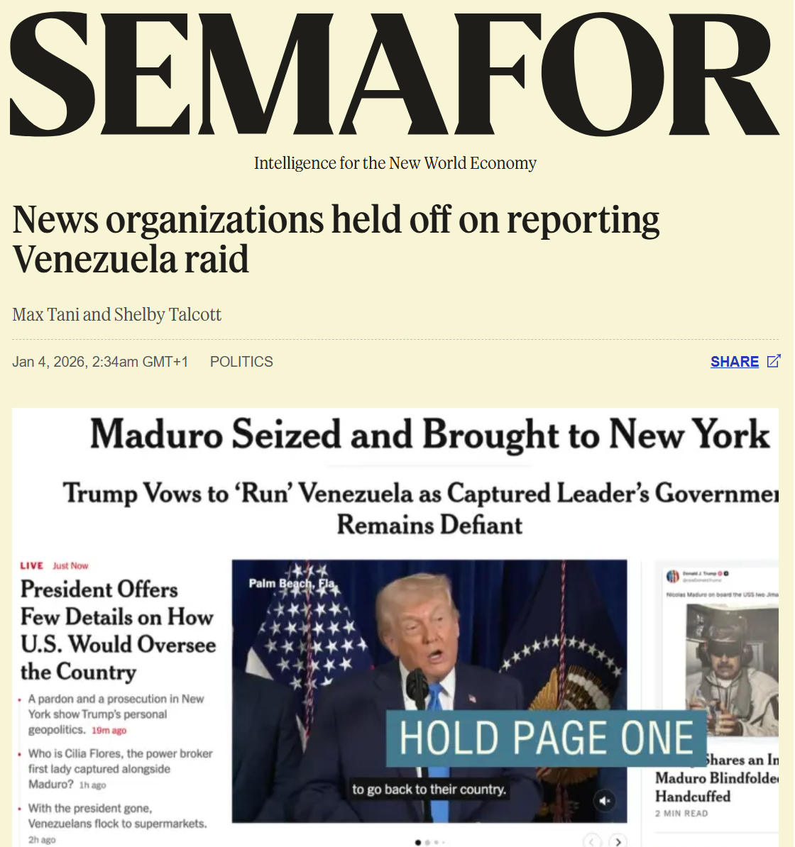"Le New York Times et le Washington Post ont découvert le raid secret des États-Unis sur le Venezuela peu avant qu'il soit prévu qu'il débute dans la nuit de vendredi à samedi – mais n'ont pas publié ce qu'ils savaient pour éviter de mettre en danger des soldats américains, selon deux personnes familières des échanges entre l'administration et ces médias." Publiée quelques heures après la conférence de presse de Donald Trump dans la nuit du samedi 3 au dimanche 4 janvier, l'information du média en ligne Semafor... n'a suscité qu'un intérêt médiatique modéré alors même que les journalistes du monde entier se précipitaient pour couvrir l'enlèvement du président du Venezuela Nicolas Maduro.