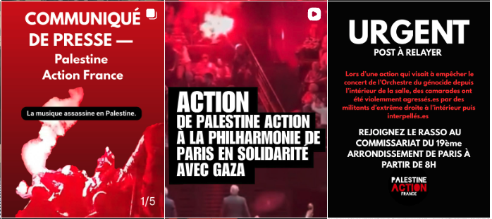 argue la militante en référence aux propos de Yair Mashiach, secrétaire général de la Philharmonie d'Israël en mai 2025. Palestine Action France rappelle qu'il s'agissait "de dénoncer la normalisation opérée par les institutions culturelles israéliennes"