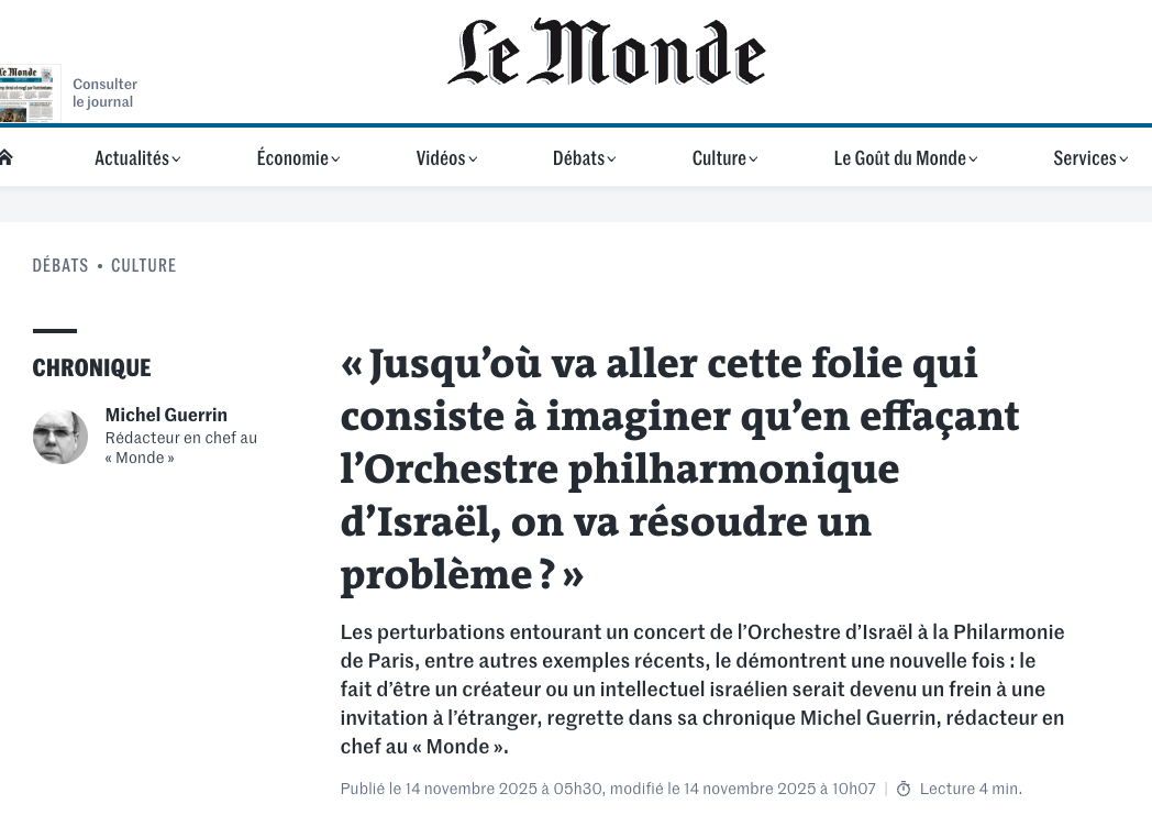 e concert Philharmonique pris pour cible hier soir a été finalement le symbole de cette haine déchaînée contre des juifs")