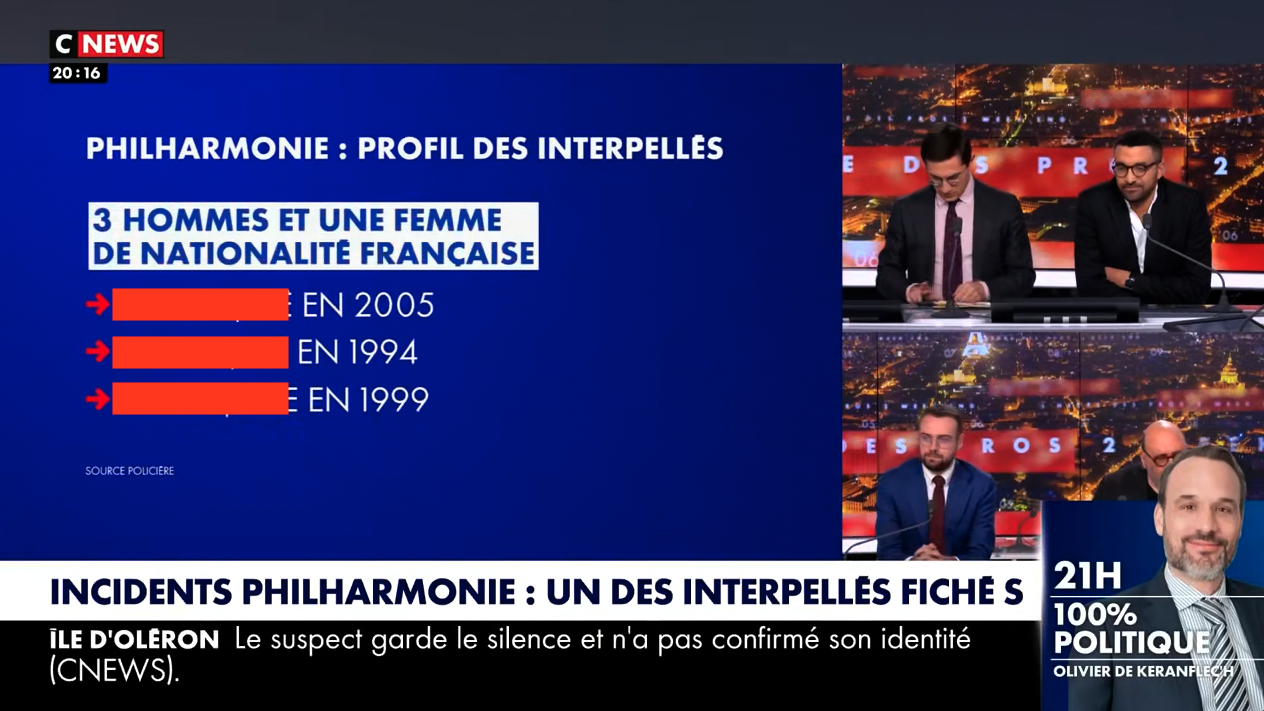 À l'antenne, CNews va jusqu'à publier les prénoms et dates de naissance des militants arrêtés.