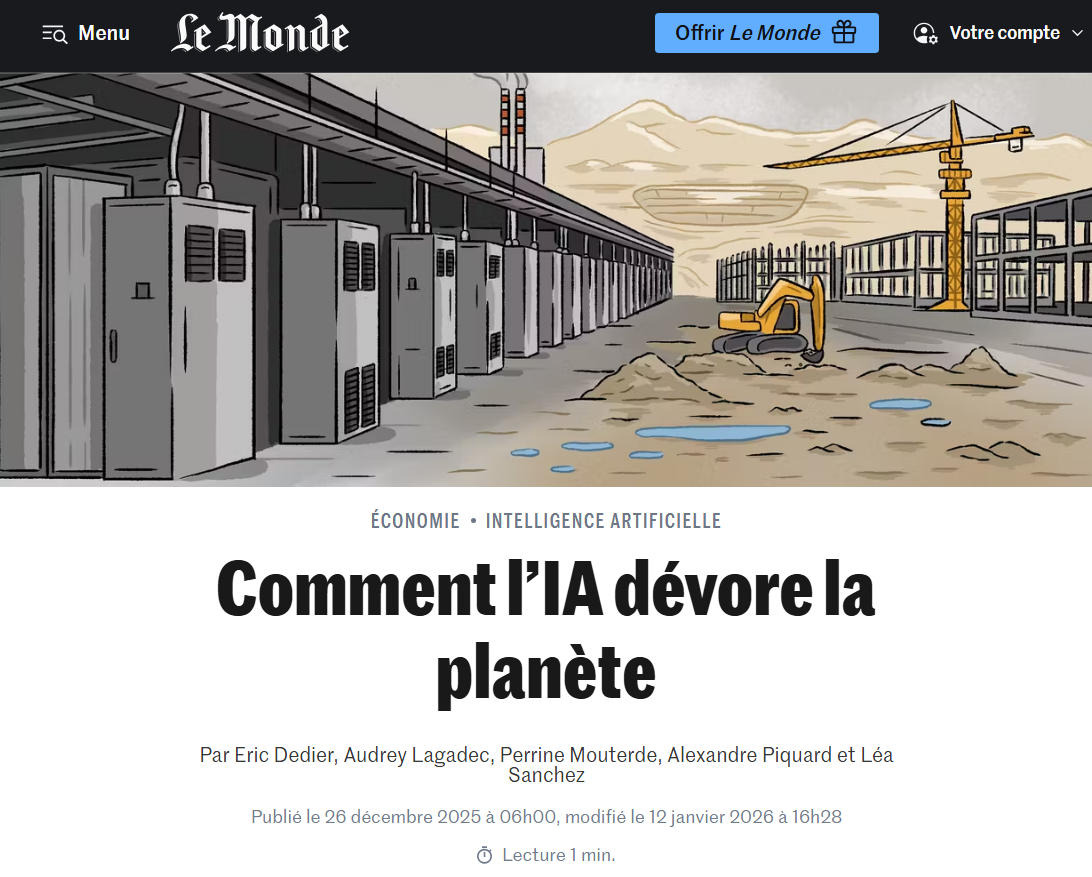 Le 26 décembre dernier, le Monde publie dans son édition papier un article racontant la consommation de ressources naturelles et énergétiques par l'IA générative. Une version infographique est aussi mise en ligne sur son site. "Pour tenter d'évaluer leur impact sur la planète, des chercheurs ont démantelé et broyé l'une des plus utilisées au monde, la Nvidia A100, affirme le quotidien. Ils y ont trouvé plus d'une vingtaine de métaux différents, dont des terres rares : les GPU sont parmi les objets nécessitant la plus grande variété d'éléments chimiques. Sur une carte pesant 1,2 kilo, on trouve 48 % de cuivre, 6,2 % de fer ou encore 0,02 % d'or."