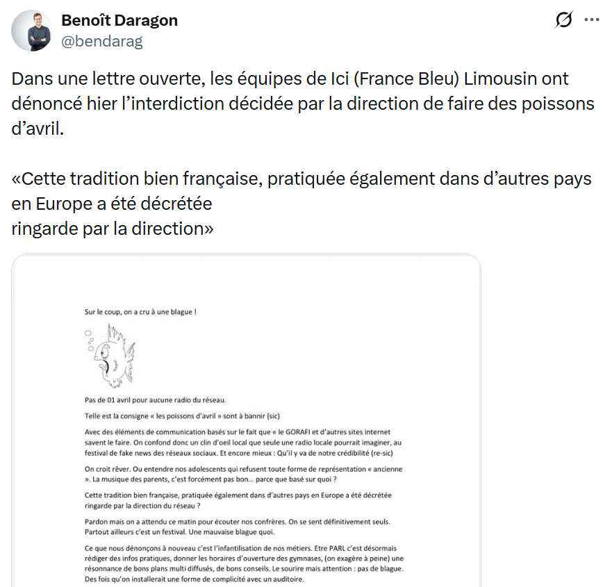 Le 2 avril, le journaliste "médias" du Parisien Benoît Daragon dévoile sur X une lettre ouverte envoyée par Ici Limousin (ex-France Bleu) à l'ensemble des cadres de Radio France, direction comprise. Les "PARLS" de la radio publique locale y protestent contre l'interdiction de poissons d'avril édictée, affirment-ils, par la direction nationale de Radio France. "Cette tradition bien française, pratiquée également dans d'autres pays en Europe a été décrétée ringarde par la direction du réseau ? Pardon mais on a attendu ce matin pour écouter nos confrères. On se sent définitivement seuls. Partout ailleurs c'est un festival. Une mauvaise blague quoi. Ce que nous dénonçons à nouveau c'est l'infantilisation de nos métiers."