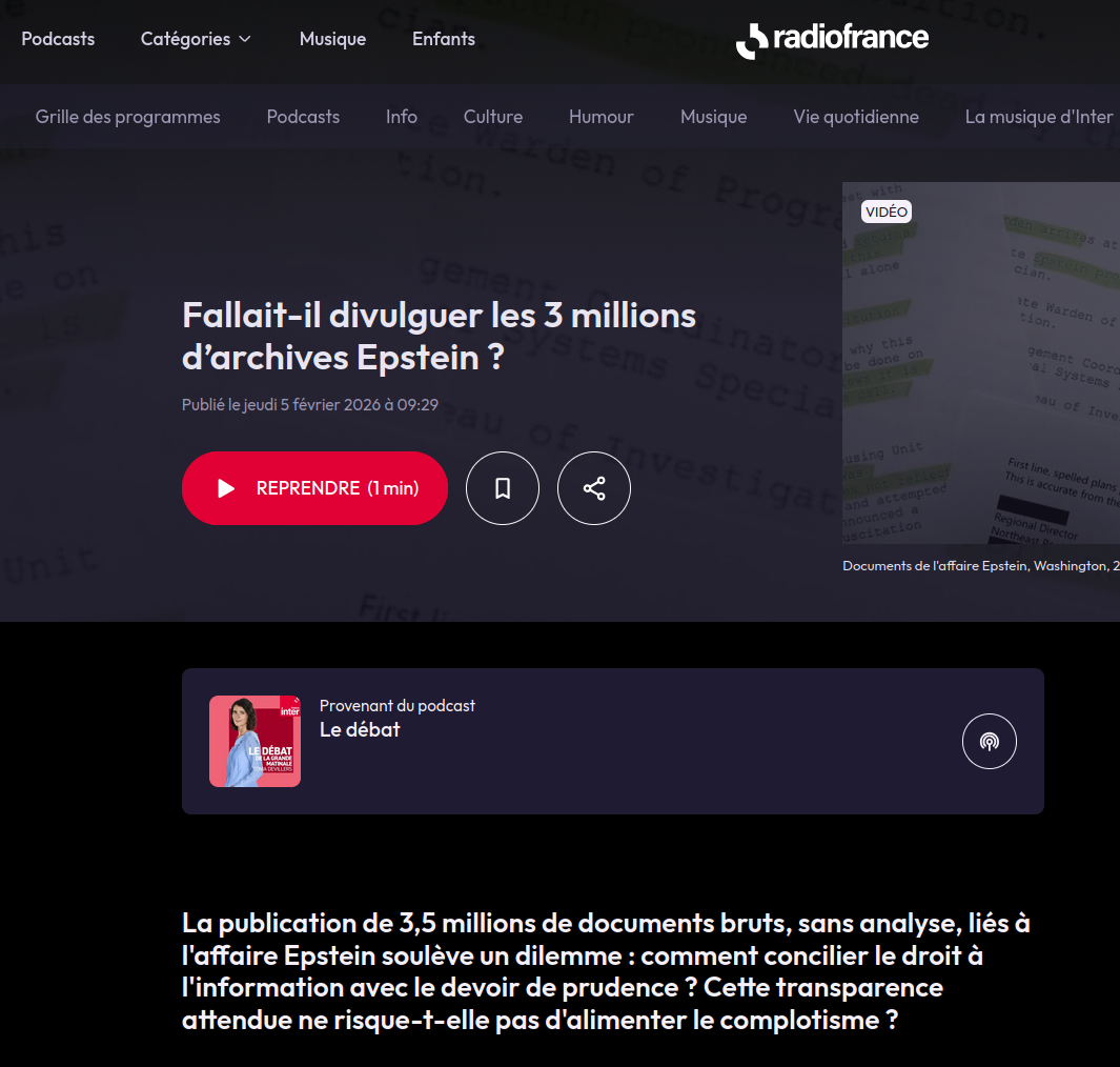 Néanmoins, la publication de cette immense masse de documents caviardés (n'importe comment) provoque simultanément une secousse chez les garde-barrières de l'information, pris de court par la matérialisation de ce que Rudy Reichstadt et Tristan Mendès France appelaient encore en novembre, sur leur émission Complorama, une "obsession complotiste". Et la place forte de l'anti-complotisme, toute à son obsession éditoriale, produit alors une réflexion stupéfiante de paternalisme bourgeois : au fond, la publication de documents prouvant a minima l'entre-soi, la solidarité de classe, l'impunité, le mensonge et la criminalité d'un groupe de puissants, de documents qui ont déjà eu des répercussions concrètes sur 28 personnalités politiques, académiques et financières serait une mauvaise nouvelle pour la démocratie. Il faut se frotter les yeux en entendant Sonia Devillers questionner Fabrice Arfi, le 5 février dans la Matinale d'Inter : "quand on met au jour cette complaisance de la part de toute une élite mondiale, ou mondialisée, est-ce qu'on nourrit aussi un sentiment de "tous pourris", un sentiment "anti-élites" qui lui aussi peut devenir assez dangereux?" Le journalisme d'investigation menace le statu quo des hiérarchies de classe et la transparence est l'ennemie de la vérité, c'est la radio publique d'État qui vous le dit.