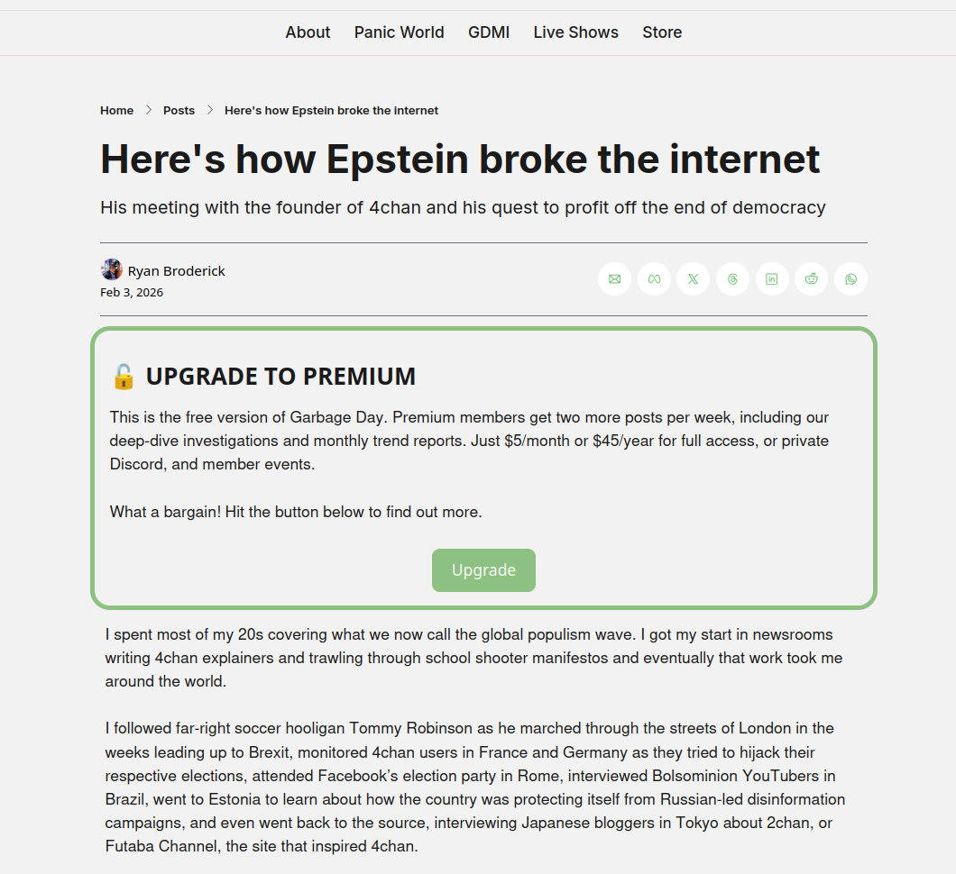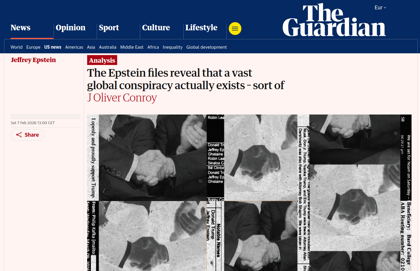 Jour après jour, de nouvelles révélations émergent de ce test de Rorschach à l'échelle sociologique. Internet fait ce qu'il sait faire de mieux : surinterpréter des faits et générer du lore, la version numérique du folklore, liquide amniotique des intenses interactions des fandoms. Les Epstein Files, immenses, incomplètes et pleines de trous, sont le territoire optimal d'un mode de consommation médiatique gamifié, dixit les chercheureuses Libby Marrs & Tiger Dingsun dans Other Internet, où s'informer revient à participer à une chasse au trésor obsessionnelle collective qui promet de "résoudre" le monde. Sur Internet, écrivait Mark Pesce dès 1997,"le réel ne se découvre pas, il se crée." La promesse est si envoûtante que certains journalistes de la presse bien élevée, pris de vertige, commencent à vaciller sur leurs bases méthodologiques. Le Guardian titre "Les Epstein Files révèlent qu'il existe bel et bien une vaste conspiration mondiale - ou presque". Ouf, c'était moins une.