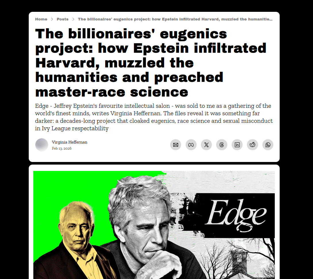Et le rabbit hole ne s'arrête pas là. Lors d'une interview de plus de deux heures, Epstein évoque le Santa Fe Institute, un laboratoire de mathématiques qu'il a fondé dans les années 1990 pour simuler des systèmes complexes. Leur approche : un "algorithme génétique", une sorte de programme informatique basé sur les lois de la sélection naturelle, qui fleure bon le croisement entre techno-solutionnisme et racisme scientifique. Dans The Nerve, on apprend l'existence du "salon" Edge, fondé en 1996 par le puissant agent littéraire John Brockman mais financé en quasi-totalité par Epstein. Un boys club annuel pour (techno) milliardaires qui semble n'avoir pour seule fonction que d'entretenir, via quelques pseudo-intellectuels et chercheurs soigneusement sélectionnés, les obsessions de cette caste : racisme scientifique, hiérarchies de QI, eugénisme (qu'Epstein appelle "altruisme génétique"), misogynie à tendance masculiniste (au point d'exiger littéralement l'exclusion des femmes du salon Edge), suprémacisme, et admiration pour le régime fasciste. On sait depuis 2019 grâce au New York Timesqu'Epstein, qui se déclarait "transhumaniste", avait clamé son intention de faire cryogéniser son cerveau et son pénis, envisageait de faire de son ranch de Nouveau-Mexique une "base" depuis laquelle il pourrait "inséminer" 20 femmes à la fois en pensant créer une "race supérieure" grâce à son ADN. La rationalité techno-scientifique mise au service, encore et encore, d'une idéologie adjacente au nazisme.