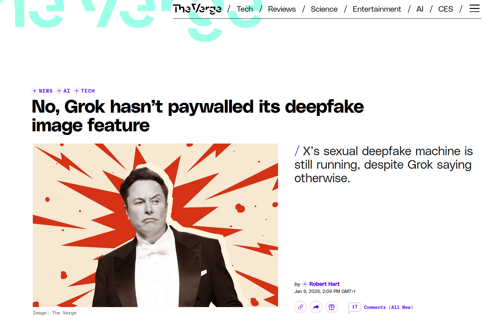 à toute demande de réaction venant des journalistes, Elon Musk répondait à des photos de célébrités en bikini (y compris de lui-même), sur X, par un émoji "mort de rire". Le 3 janvier, l'entreprise publiait un communiqué pour, en substance, blâmer les utilisateurs plutôt que le système. Le 9 janvier, X annonce limiter la fonction de génération d'images sexualisées aux seuls abonnés payants du logiciel – ce qui, en plus d'être techniquement faux, tel que le révèle The Vergele même jour (et n'en déplaise à la couverture presse générale, qui se contentera, comme d'habitude avec les mensonges d'Elon Musk, de reprendre le communiqué sans vérifier qu'il dit vrai), confirme que la pornographie non-consensuelle fait partie intégrante du business model de la plateforme. Lorsque les utilisateurs de X tentent de générer de telles images, Grok ne leur répond pas qu'elles sont interdites, mais que la fonction doit être débloquée en achetant le plan "SuperGrok". Prix de la pédopornographie : 30 dollars par mois, sans engagement.