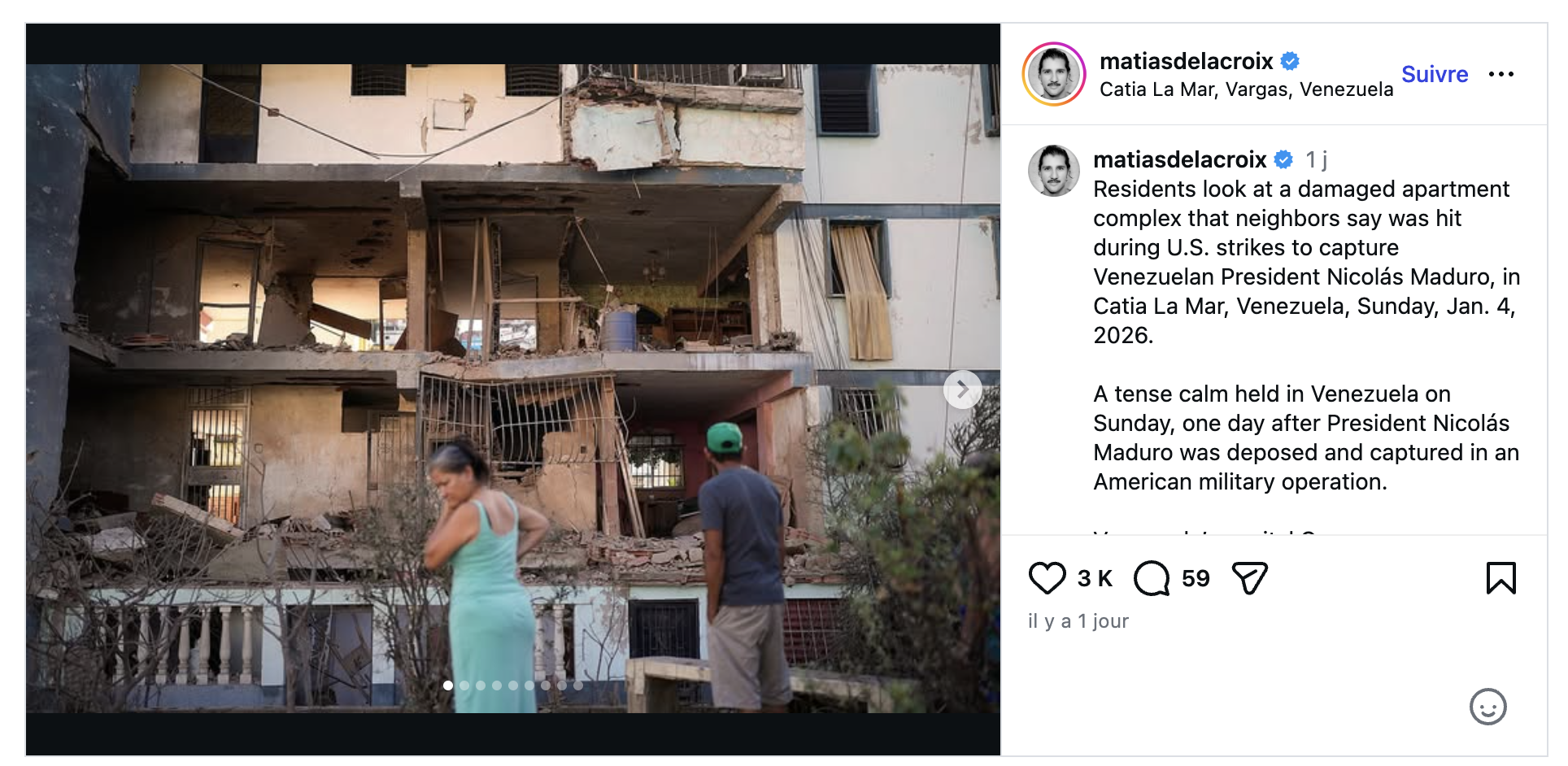 Mais les images de son immeuble éventré à La Guaira (où se trouvent les port et aéroport de Caracas) déjà visibles depuis le 4 janvier, auraient pu et surtout du susciter l'intérêt et les questionnements des journalistes français.
