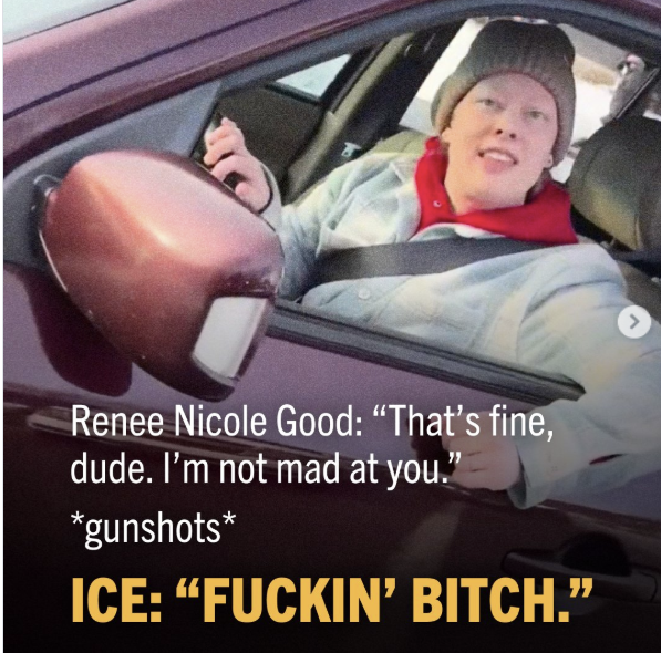 Pire encore : aucun n'a réagi non plus aux réactions effroyables du pouvoir américain à la mort de Good. Trump et Vance, pour ne parler que d'eux, ont brodé sur le thème du terrorisme intérieur, de la militante extrémiste, malheureusement endoctrinée. Epaulés par la presse d'extrême droite, ils s'efforcent de présenter comme des terroristes les "ICE watchers", ces citoyens qui s'efforcent, par tous les moyens non-violents, et par une sagace utilisation des réseaux sociaux (voir cette excellente enquête de TV5), de documenter, de visibiliser et d'entraver les traques sauvages et violentes aux migrants de ICE. Comme si abattre des opposants dans la rue était désormais tacitement autorisé.