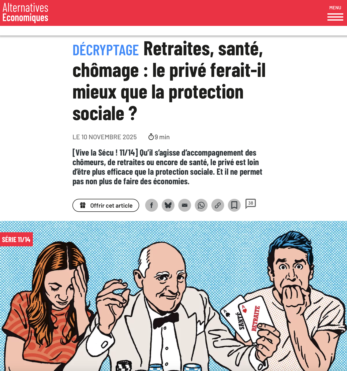 En juin dernier, le Monde diplomatique revenait sur les "mythes et mensonges de la capitalisation" : "Les premières caisses de retraite mises en place au milieu du XIXe siècle puis le premier système de retraite national instauré en France en 1910 reposaient sur cette logique [de capitalisation]. Incapables de servir des pensions permettant aux retraités d’échapper à la pauvreté et inadaptés aux périodes de forte inflation (fréquentes à l’époque), ils furent abandonnés. À la création de la Sécurité sociale, on leur préféra la répartition. Elle a depuis démontré sa capacité à faire face aux crises financières et à sortir progressivement les retraités de l’indigence : leur taux de pauvreté en France est l’un des plus faibles d’Europe." Il y a quelques jours, Alternatives économiques se demandait de son côté : "Retraites, santé, chômage : le privé ferait-il mieux que la protection sociale ?" : en matière de santé, le privé est plus cher et moins efficace que le public. Mais le cadrage médiatique généraliste continue de vouloir débattre des bienfaits fantasmés du tout privé.