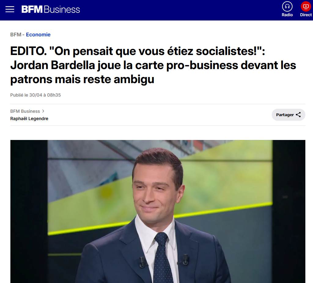 Quel est alors le champ lexical employé par les rares médias rapportant l'information ? Dans Valeurs actuelles et l'hebdomadaire local Affiches Parisiennes, Bruno Retailleau "dévoile" ou "fait" des "propositions économiques". Des propositions consistant notamment à (retenez votre souffle) "encourager l'investissement", comprendre des aides aux entreprises, mais aussi diminuer les cotisations sociales, ou supprimer le collège unique. Jordan Bardella, lui, est venu en "opération séduction" proposer "travail, ordre et prospérité" en présentant "son programme économique" pour citer le résumé de l'Opinion – ou "faire la cour aux petits patrons" selon Causeur. De son côté, le Nouvel Obsindique que le RN "courtise les patrons". Un choix moins engageant que le premier titre choisi à en croire l'URL de l'article ("le RN cible les patrons"). BFM Business, relayant l'Opinion, estime que Bardella"joue la carte pro-business".