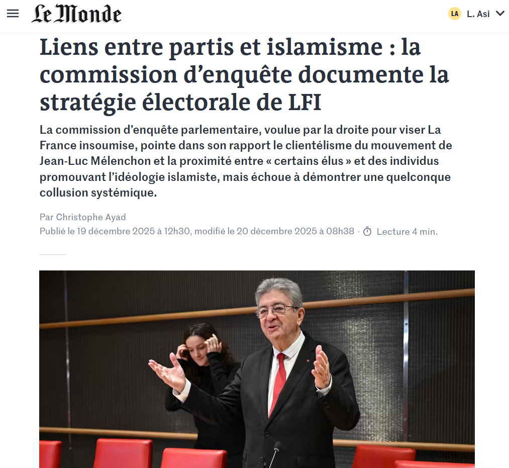 Quand le Monde titre "Liens entre partis et islamisme : la commission d'enquête documente la stratégie électorale de LFI" tout en résumant dès le chapô de cet article du 19 décembre que ladite commission "échoue à démontrer une quelconque collusion systémique", le quotidien s'attire les foudres du journaliste Rémi Carayol. "À montrer dans toutes les écoles de journalisme, à la rubrique: «Ce qu'il ne faut surtout pas faire»", poste-t-il avec la précision suivante : "À la décharge du ou de la SR (secrétaire de rédaction, ndlr), l'article est un bijou d'ambiguïté." Le journaliste politique du Monde Christophe Ayad y conclut : "Comme d'autres auparavant, du PCF à la droite conservatrice, LFI se livre assurément à un clientélisme électoral envers la communauté musulmane."
