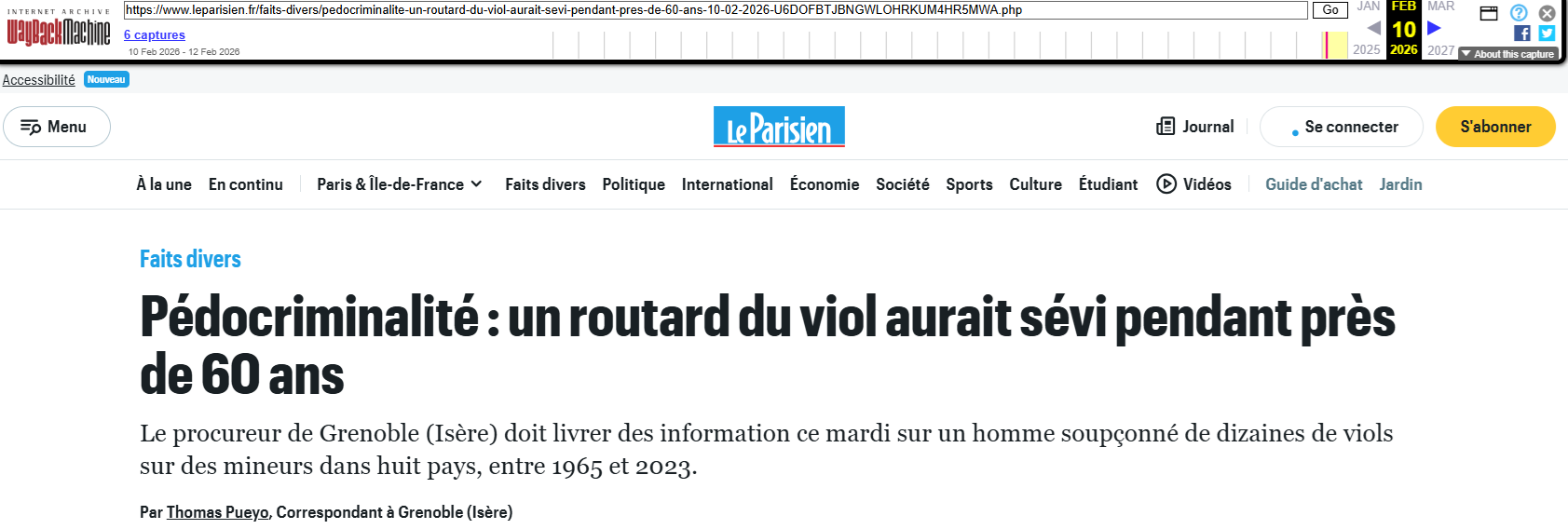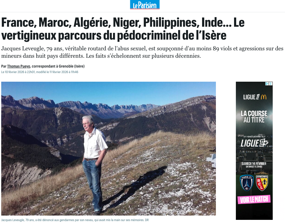"Soupçons de viols et agressions sexuelles sur 89 mineurs, double meurtre familial… Ce que l'on sait du septuagénaire mis en examen en Isère." L'article de la rubrique faits divers du Parisien rapporte les faits - glauques - de "l'affaire hors normes" partagée le 10 février par le parquet de Grenoble. Un homme de 79 ans a été mis en examen et placé en détention provisoire en 2024 pour "des viols et agressions sexuelles aggravés commis sur 89 mineurs pendant 55 ans". Le journal ajoute : "Il a ensuite été placé sous un contrôle judiciaire très strict « qu’il n’a pas respecté », et il a donc de nouveau été placé en détention provisoire « depuis avril 2025 », selon le procureur." Les viols et agressions sexuelles se seraient produits de 1967 à 2022. Ils auraient été commis "en Allemagne, Suisse, Maroc, Niger, Algérie, Philippines, Inde, Colombie et Nouvelle-Calédonie, où il était éducateur".